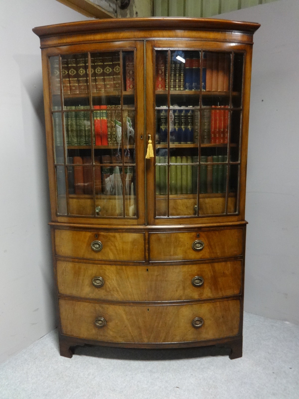 A very good Regency bowed bookcase, chest of drawers base on bracket feet and brass handles, bowed glass top with inner full width drawer and two shelves, original locks, excellent colour and condition.