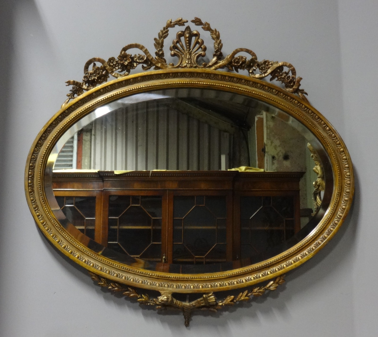 This is a very good 19th Century Victorian antique oval beveled mirror with ribbon detailing, in very good original condition.