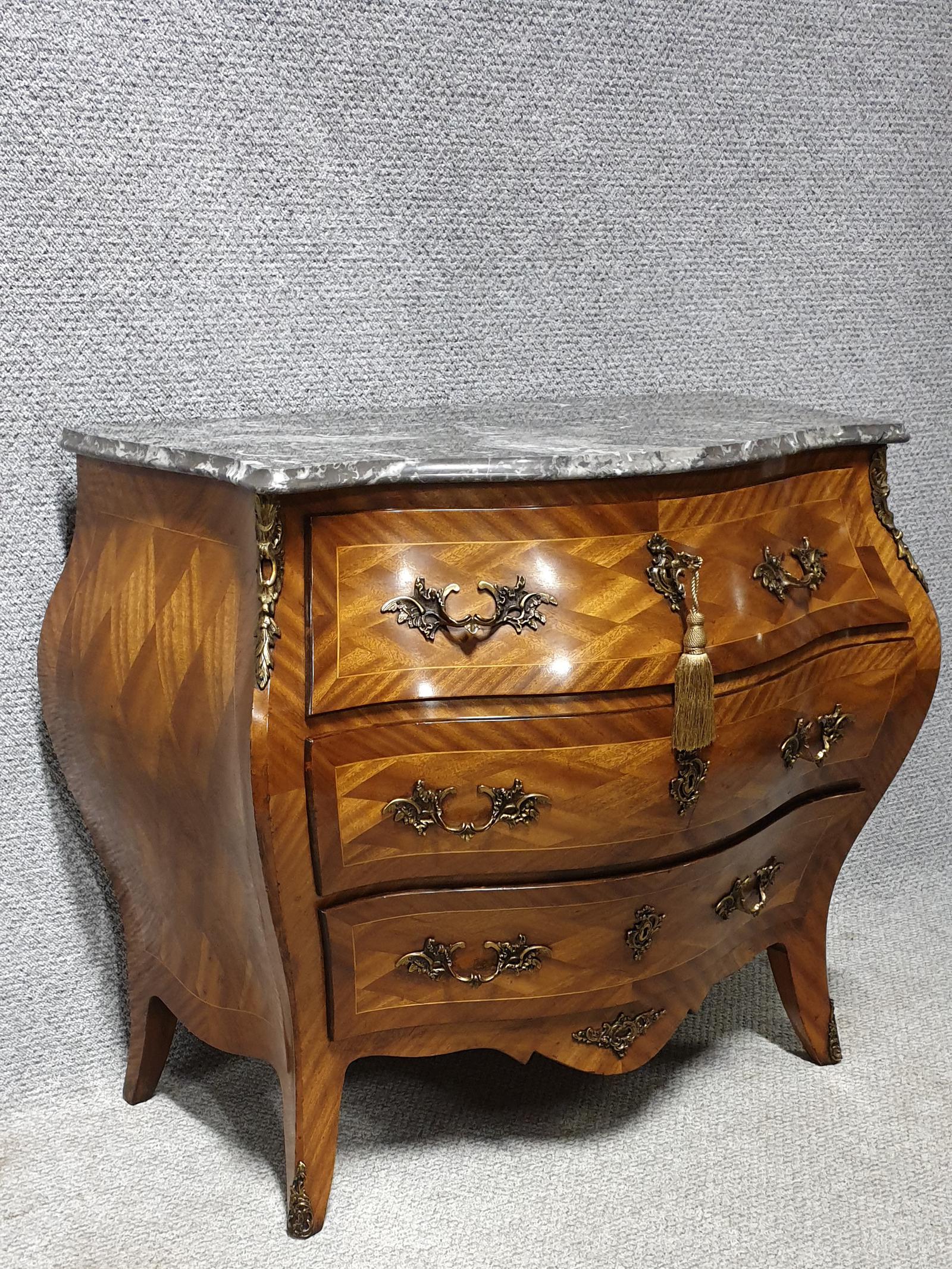 Lovely quality three drawer bombe shaped parquetry commode chest of drawers. Ormolu handles and mounts, topped with a grey marble top. Excellent colour and condition.