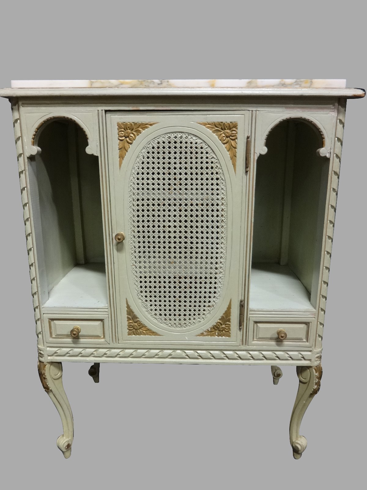 This is a very pretty French painted antique cabinet, single door with bergere front, two side openings and small drawers under, very good original condition with a lovely marble top.