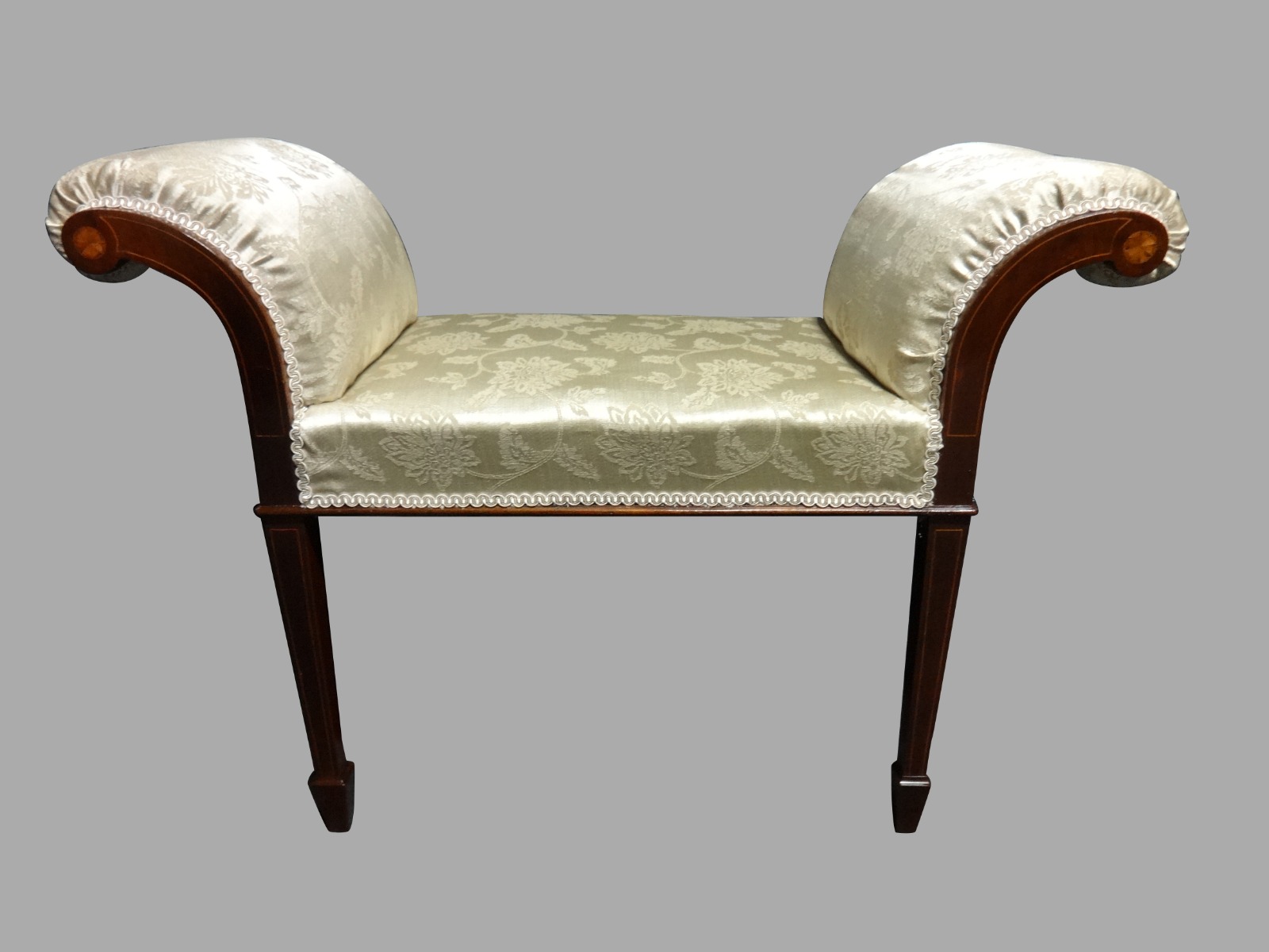 This is a very good quality Edwardian outswept window, dressing table seat, upholstered in ivory damask, excellent colour and condition.