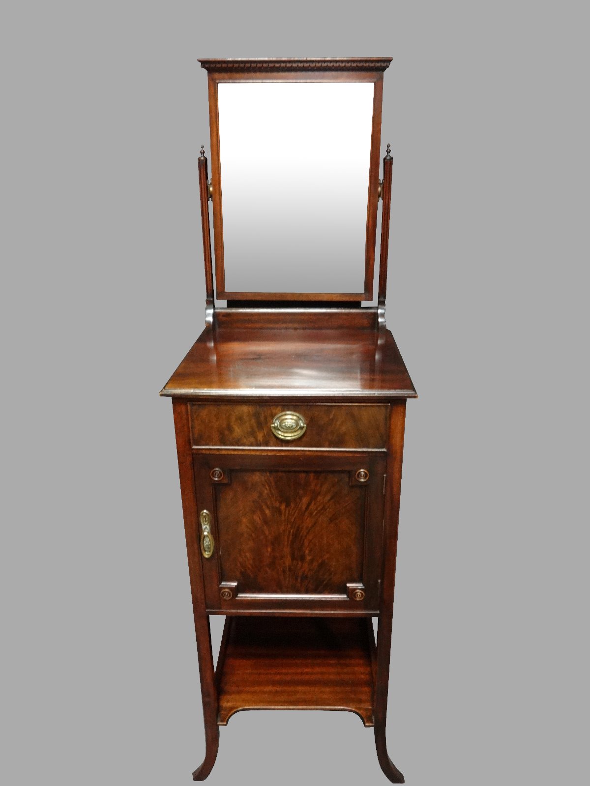 This is a very nice Edwardian antique mahogany washstand with bevelled edged mirror, single drawer and door, in very good condition.