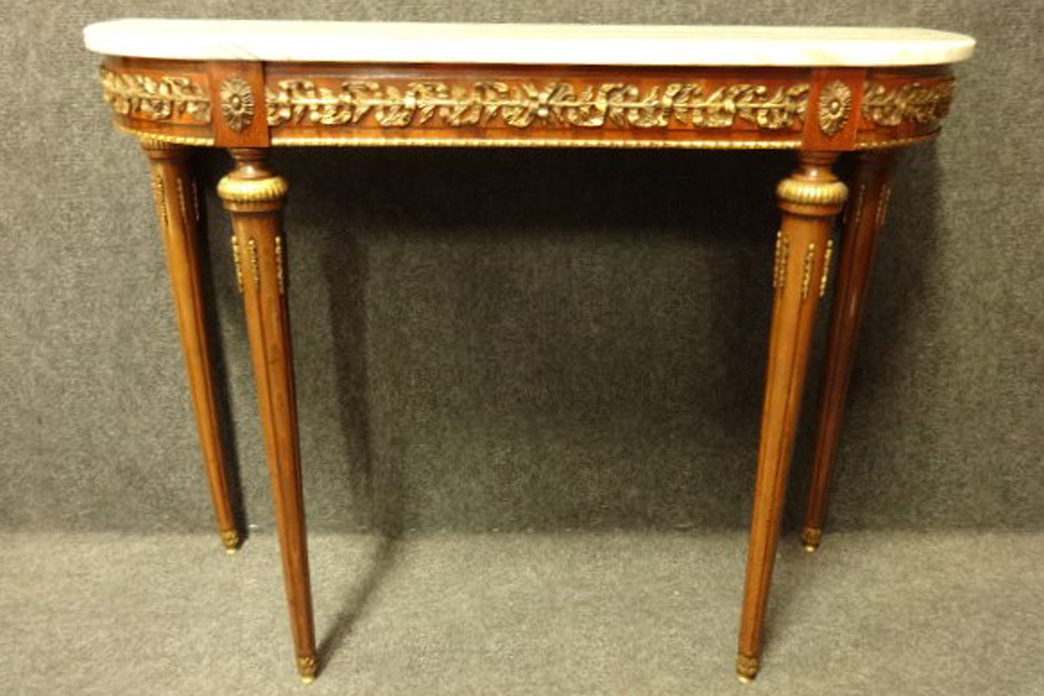 Very pretty mahogany console with brass feet and mounts, good white marble with grey veins, in very good condition.