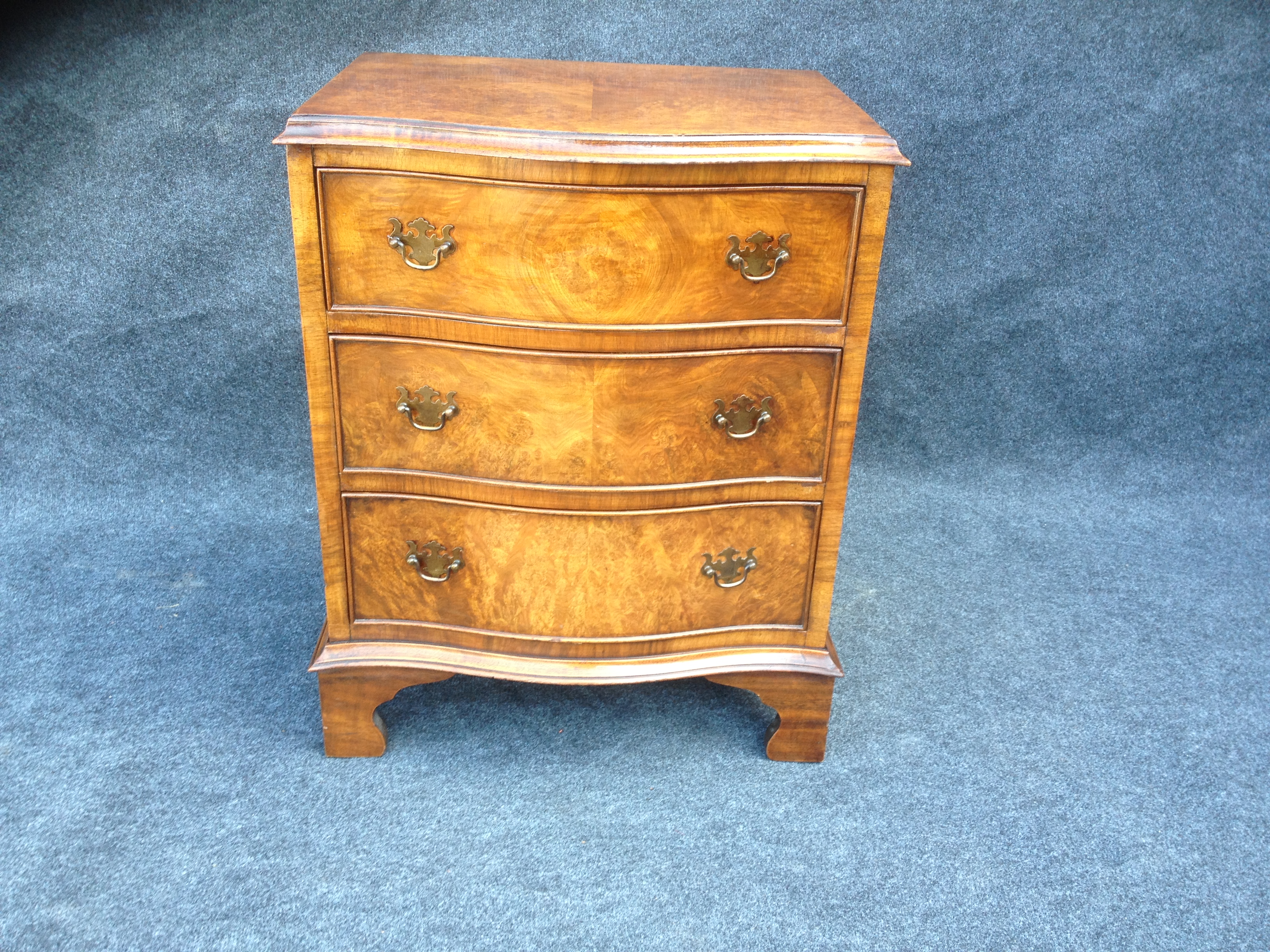 Very pretty Serpentine Burr Walnut Chest with small proportions with 3 drawers, brass handles and standing on bracket feet.
