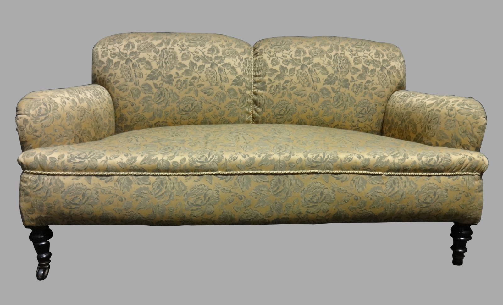 This is a very good 19th Century Victorian antique sofa, couch with turned ebony legs and black castors, upholstered in burnished gold and pale green fabric, in very good condition.
