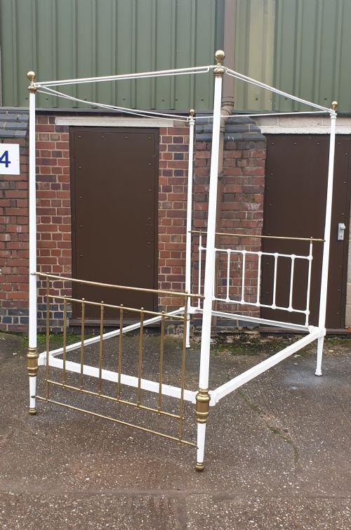 Victorian brass and iron four poster double bed, in very good condition, comes with a new pine slatted bed base. Breaks down for ease of transport.