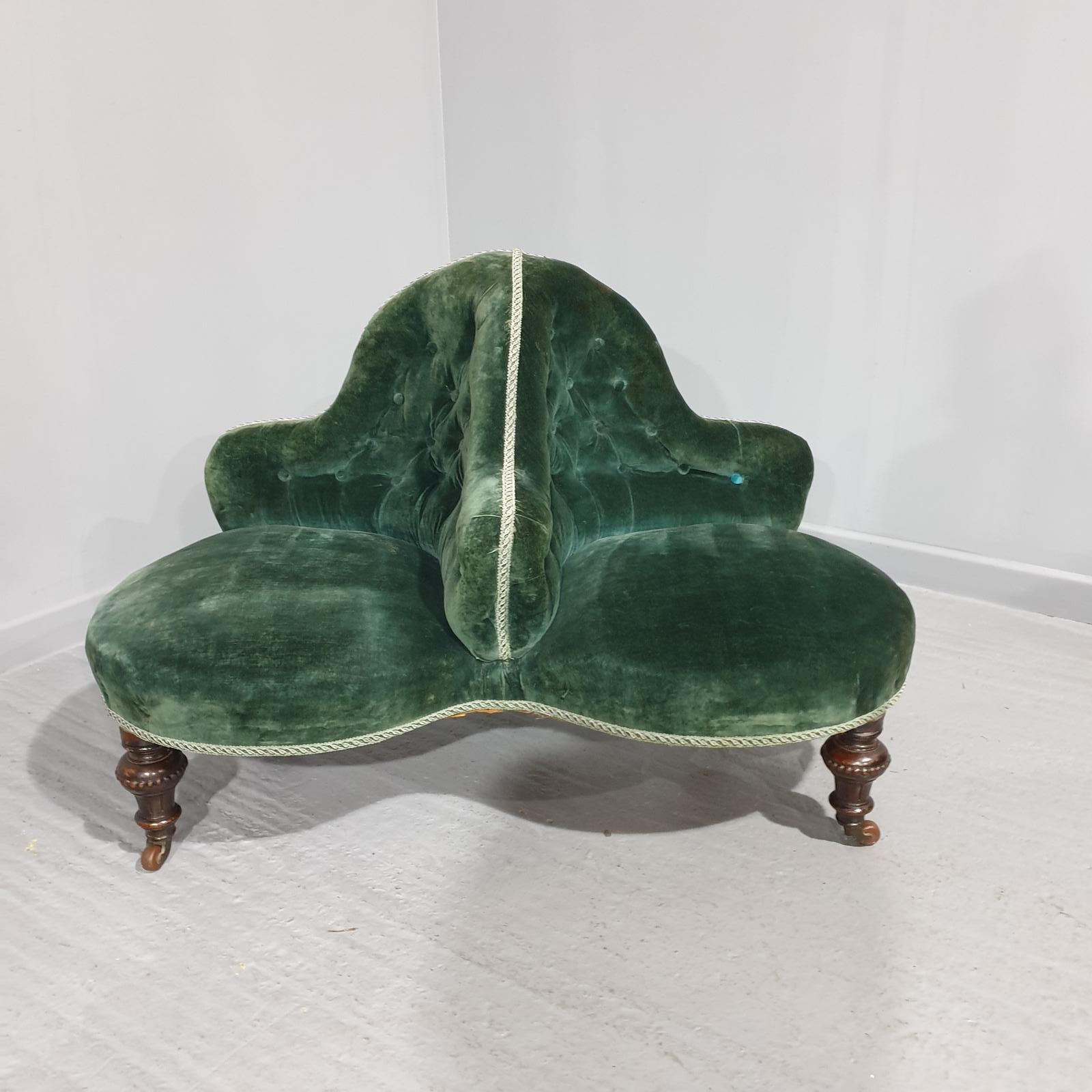 This is a very pretty late 19th Century Victorian antique mahogany conversation seat for two, in very good condition, original teal plush fabric in very good condition.