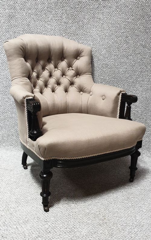 A very nice Victorian deep buttoned easy chair recently upholstered in oatmeal linen fabric, original brass castors, lovely colour and condition.