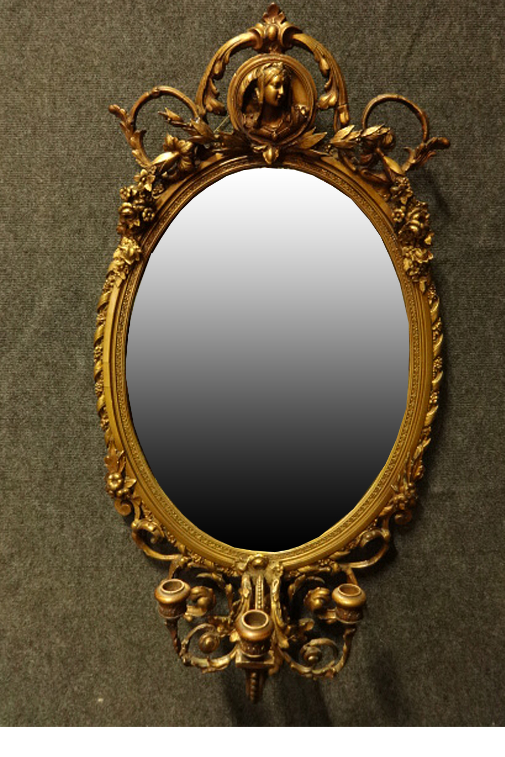 This is a very good 19th Century Victorian antique gilt oval mirror with candle sconces. It has gesso mouldings.