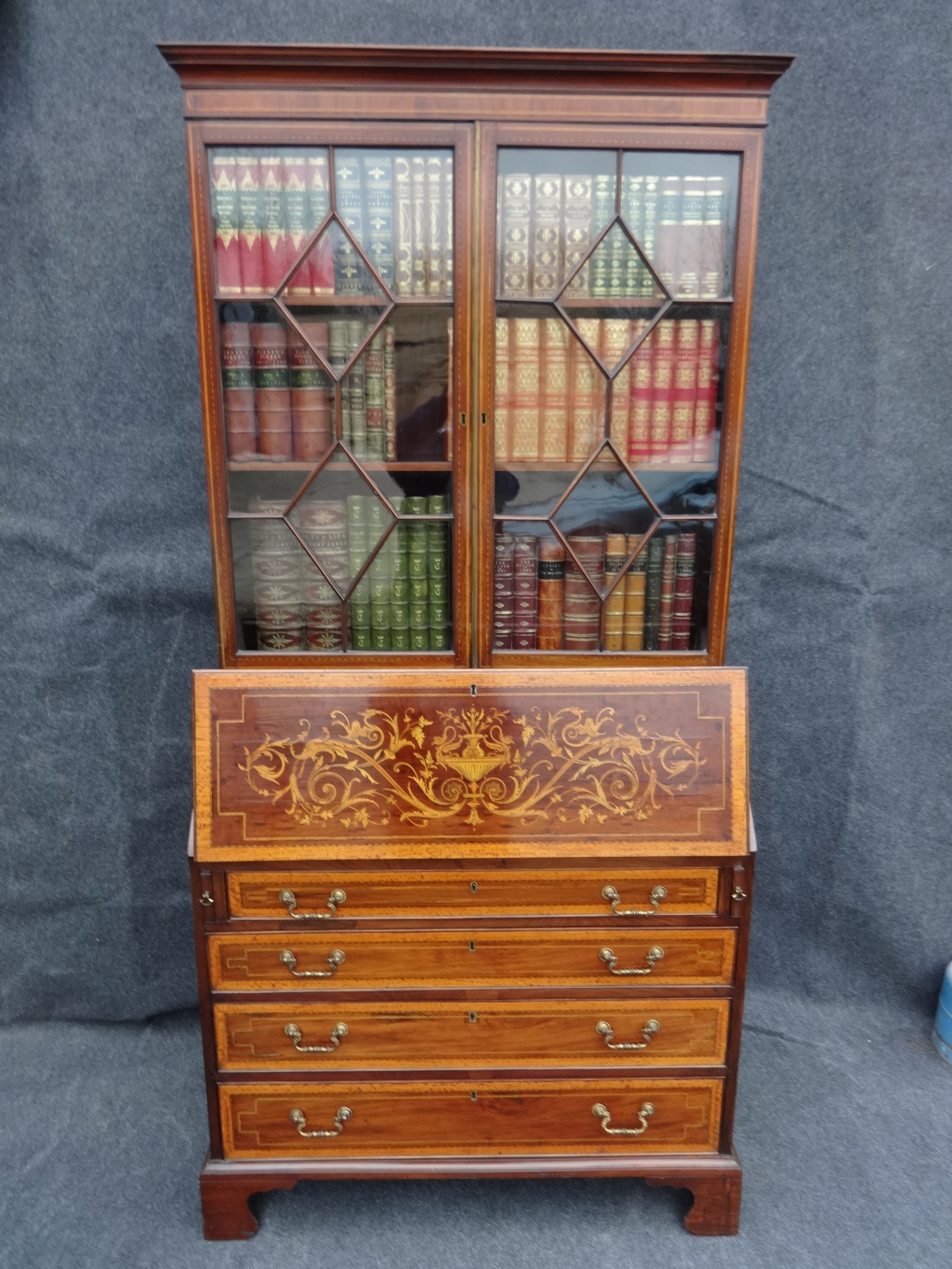 Stunning inlays, astral glazed doors with brass slamming strip and adjustable shelving, the bureau with very good inlaid interior, top quality marquetry fall front (slight stress cracks), 4 inlaid oak lined drawers, standing on bracket feet, in original condition.
