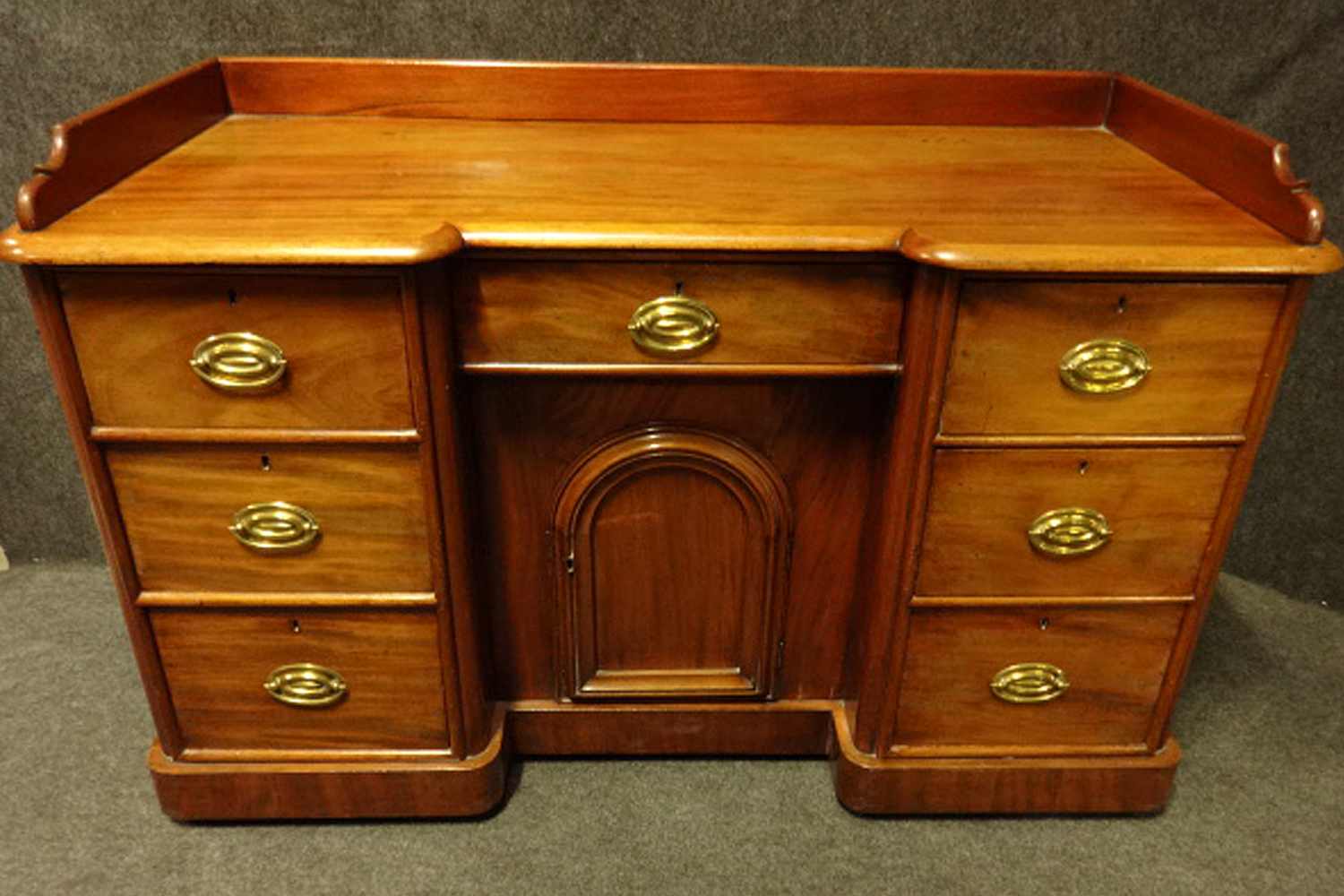This is a good Victorian breakfront mahogany desk with seven drawers and cupboard under, brass handles and original castors. It is in very good original condition.