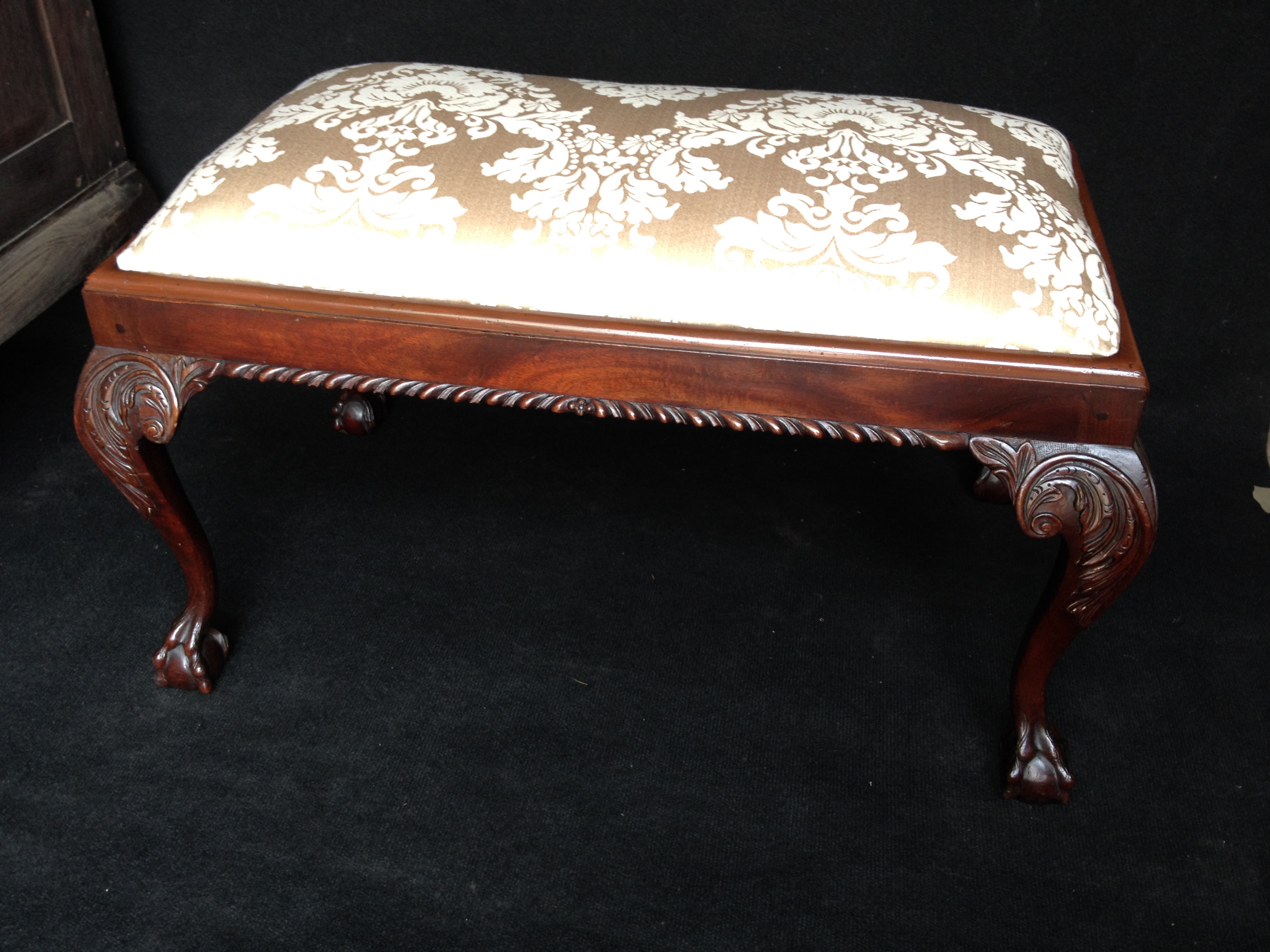 A Victorian Mahogany Duet Stool with drop in re-upholstered seat in ivory damask which stands on a ball and claw feet.