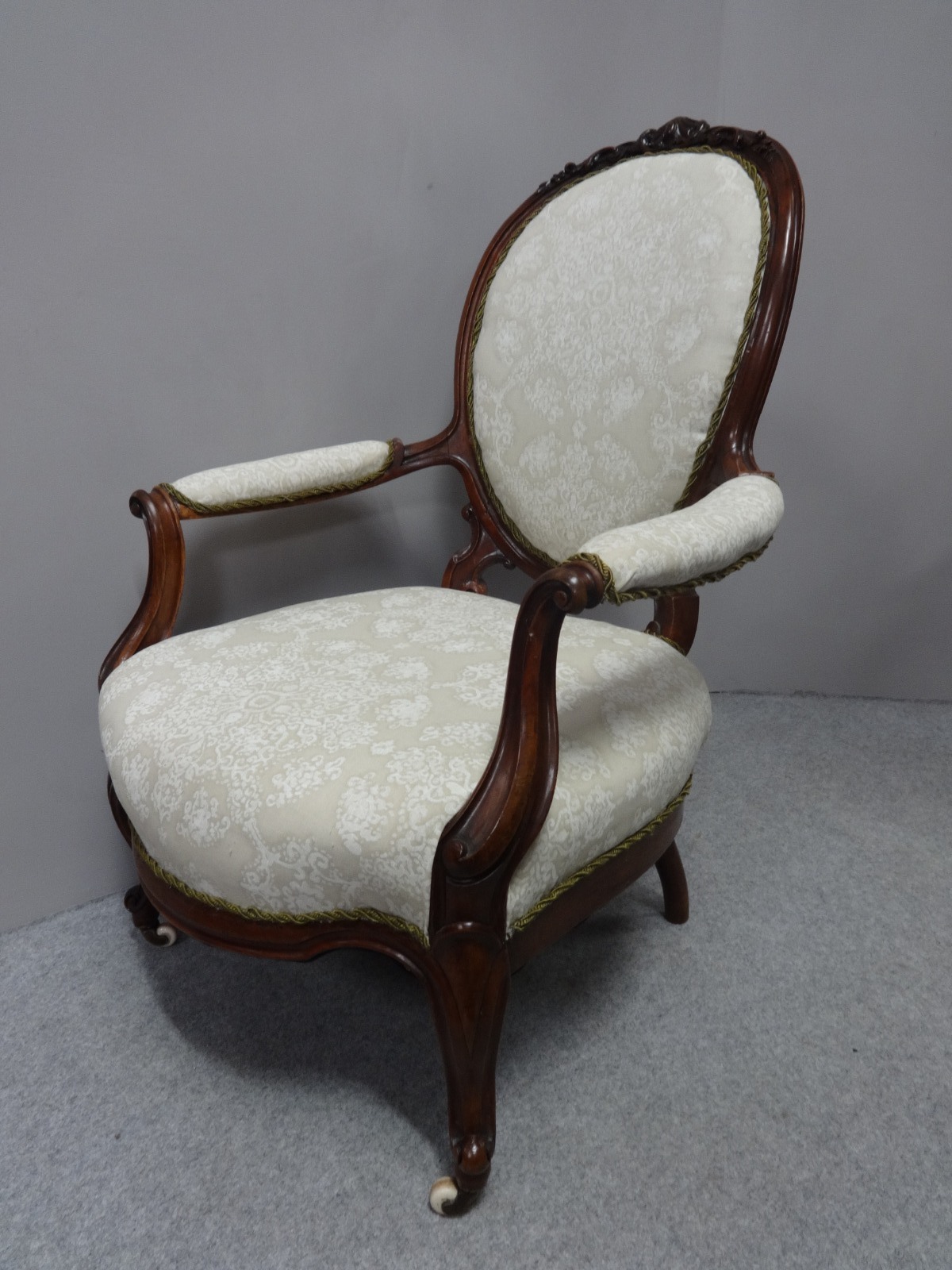 A very good 19th Century Victorian antique mahogany ladies armchair, recently reupholstered, in excellent condition with original white castors.