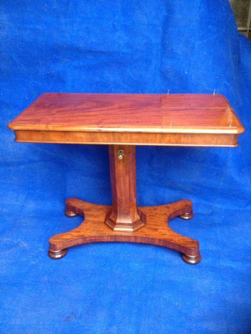 A rare vintage mahogany lecturn writing table from 1860. This vintage antique has side to side action for use in a bedroom or next to a chair as well as dueting as an action book stand with rise and fall action that stands at 5 inches high and has brass supports and original castors.