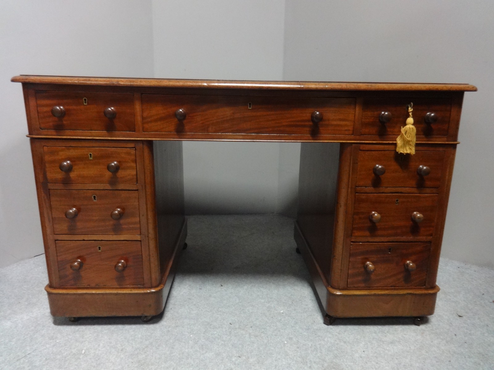 A good Victorian mahogany nine drawer pedestal desk with blue leather, splits into three, in very good condition.