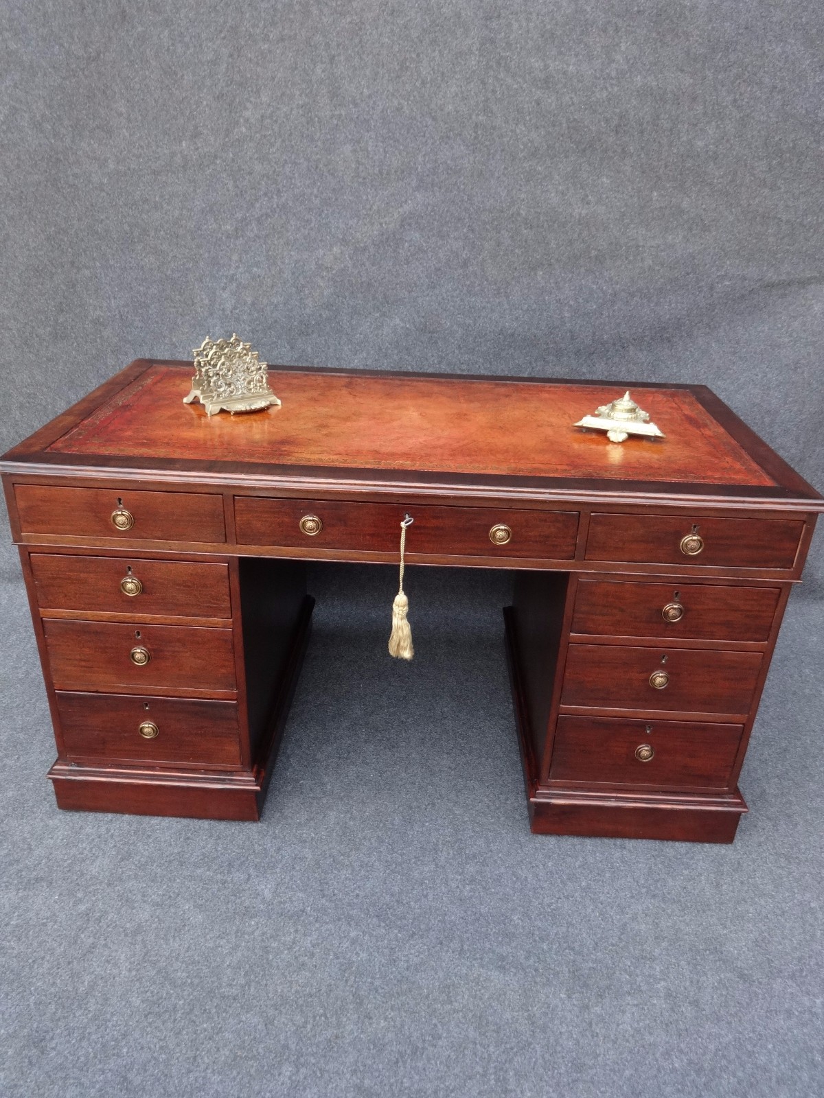 Offered for sale is this fantastic antique Victorian mahogany pedestal desk which has 9 drawers, excellent quality leather, brass handles and polished back.