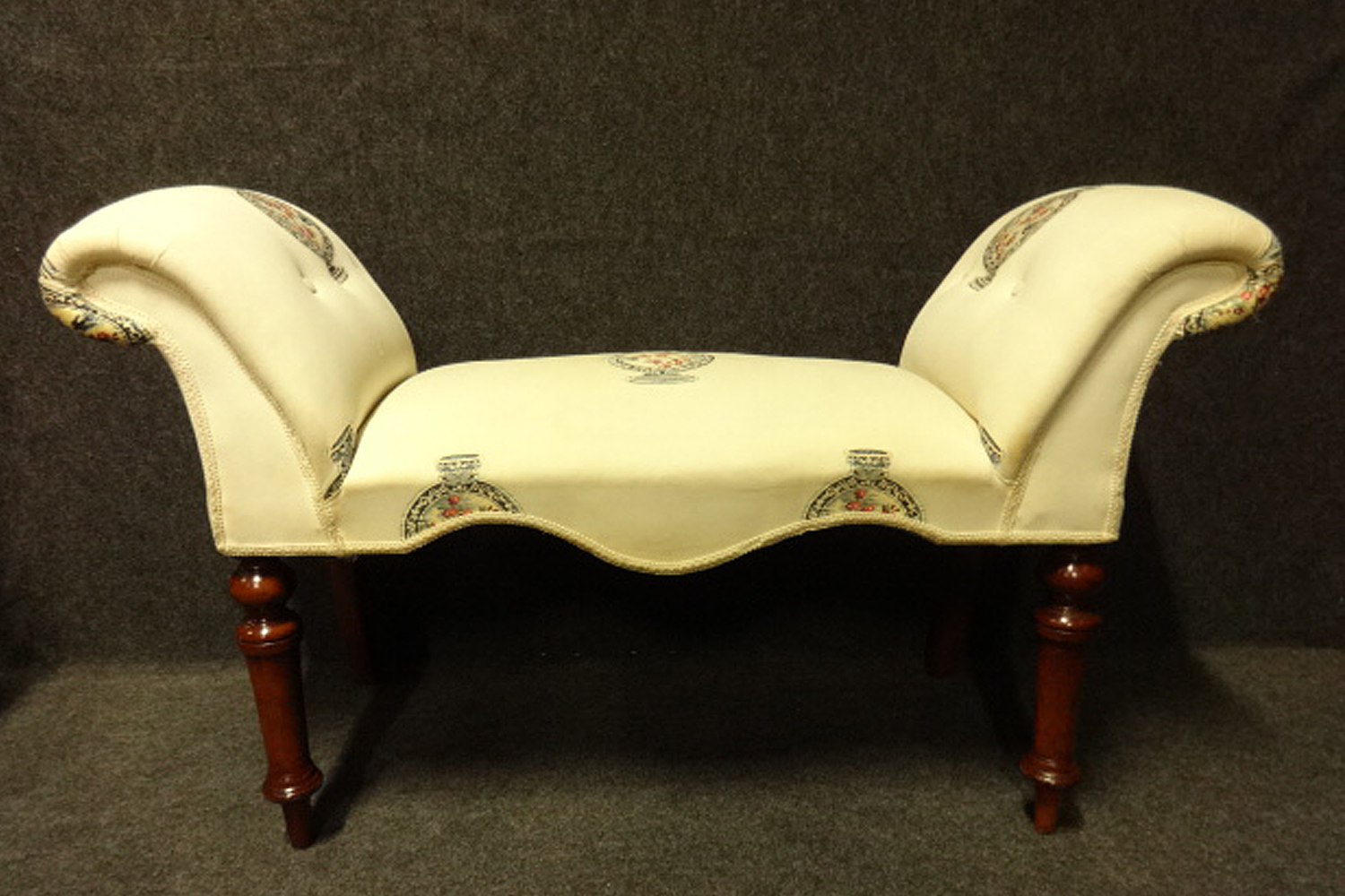 This is a good 19th Century Victorian antique mahogany window seat, turned legs to the front straight legs to the back, outswept sides.