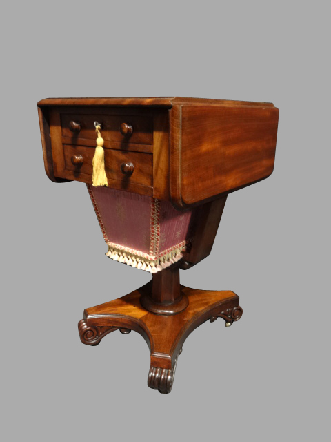 This is a very good quality 19th Century Victorian antique mahogany work table, with drop flaps, two drawers and sewing box under, sitting on a single pedestal cradle base and platform base, brass castors, excellent colour and condition.