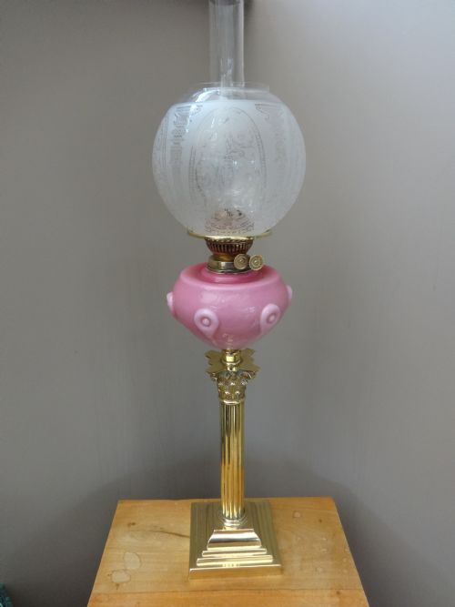 A very good Victorian double burner oil lamp with good etched glass shade excellent moulded reservoir and good corinthian column brass base, all in excellent condition.
