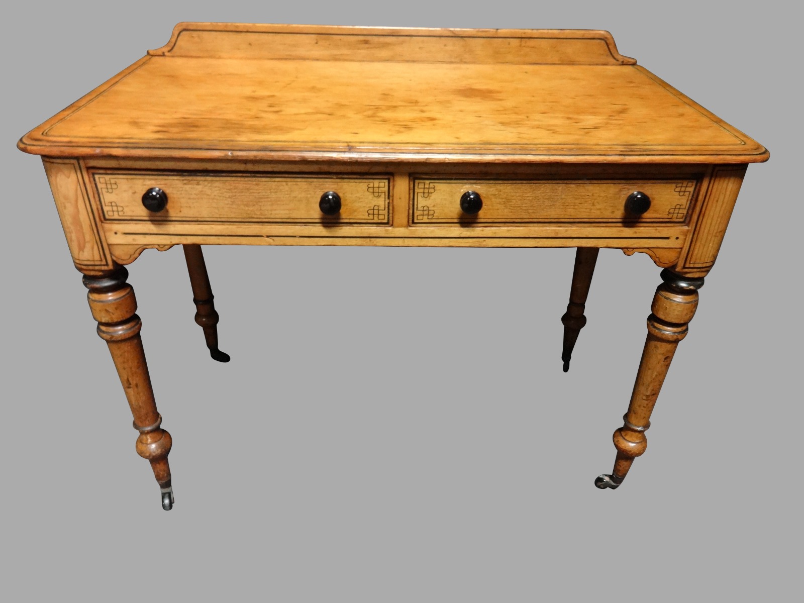 This is a nice 19th Century antique two drawer desk side table, black lines and original black porcelain knobs, in very good overall condition.