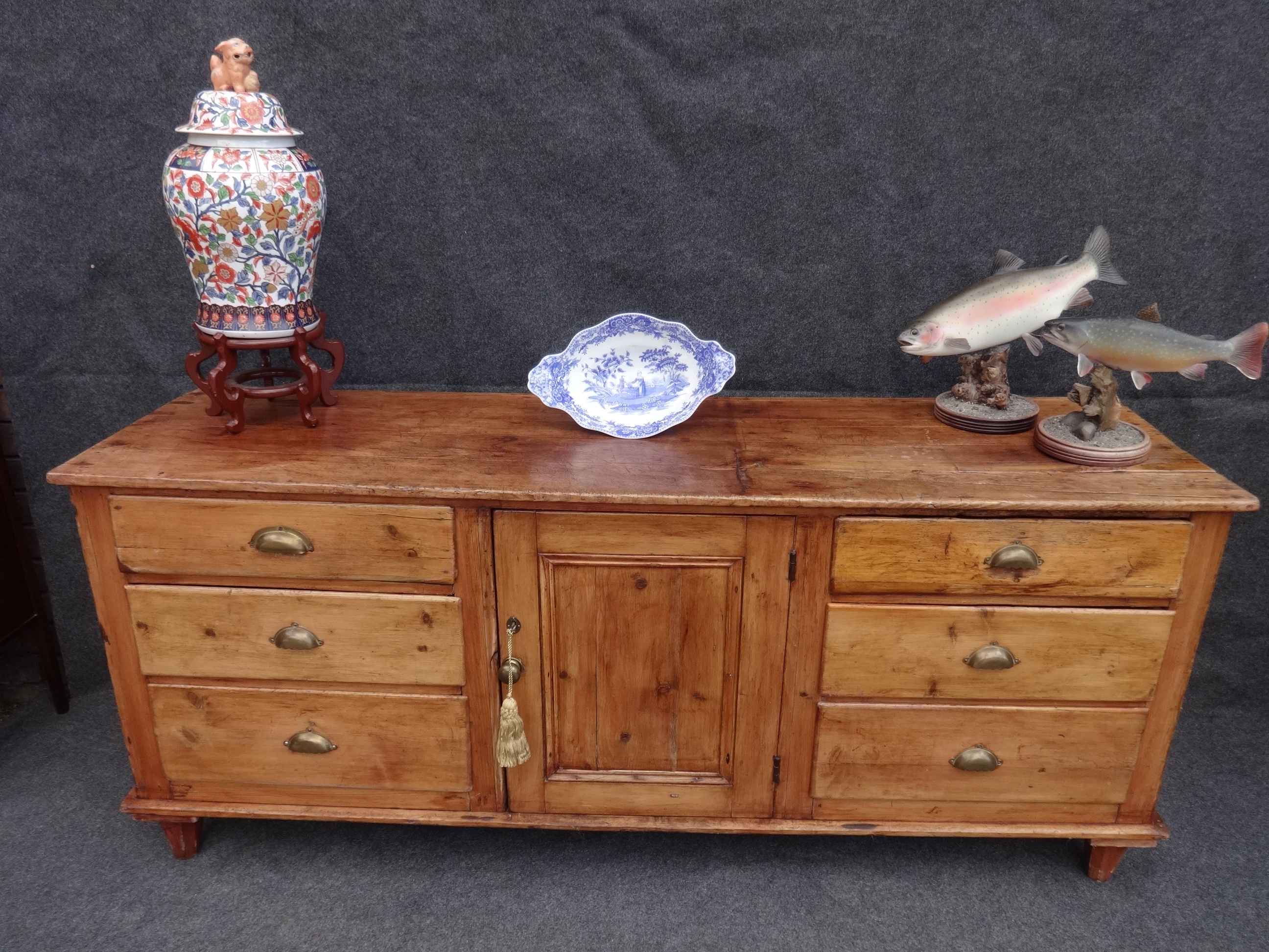 This is a fabulous antique Victorian pine dresser base which has a central door, 6 drawers and it stands on stump feet. It has a very good colour and original look to it. It has brass cup handles.