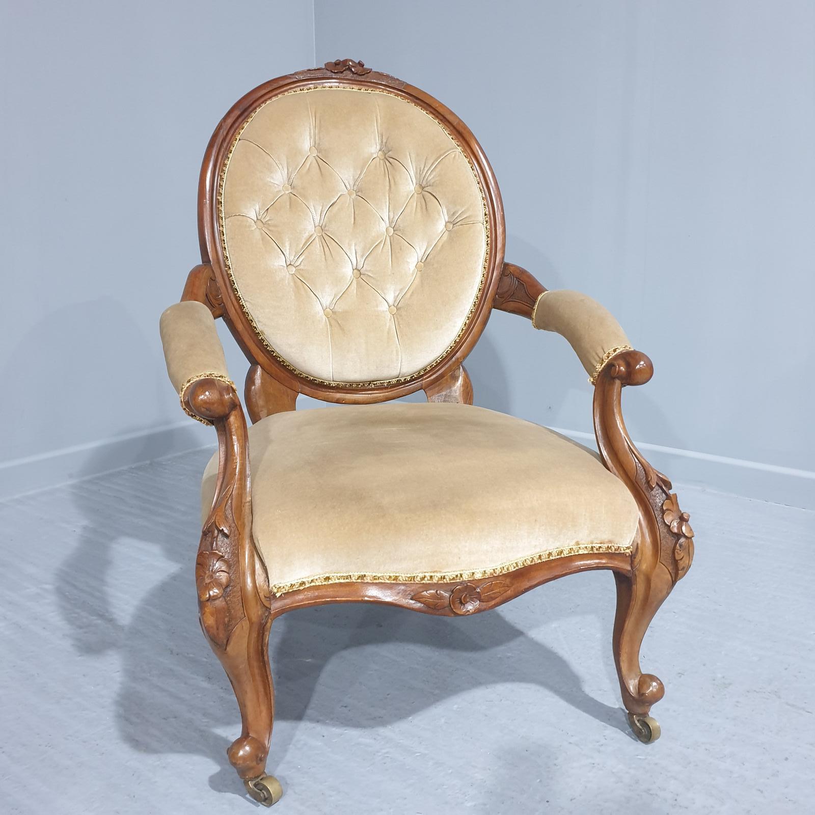 This is a superb mid 19th Century Victorian antique walnut grandfather armchair, with original dark gold plush upholstery, in overall excellent condition.