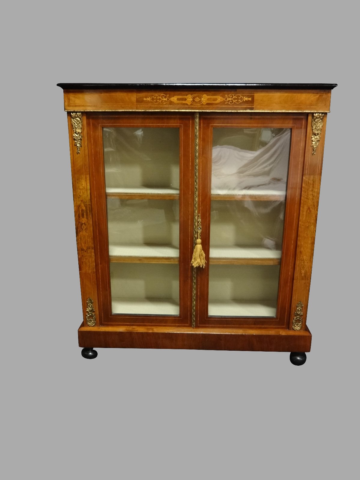 This is a 19th Century Victorian antique walnut bookcase pier cabinet inlaid with boxwood, repolished to a high standard, and relined. brass mounts and slamming strip. It has working lock with key.