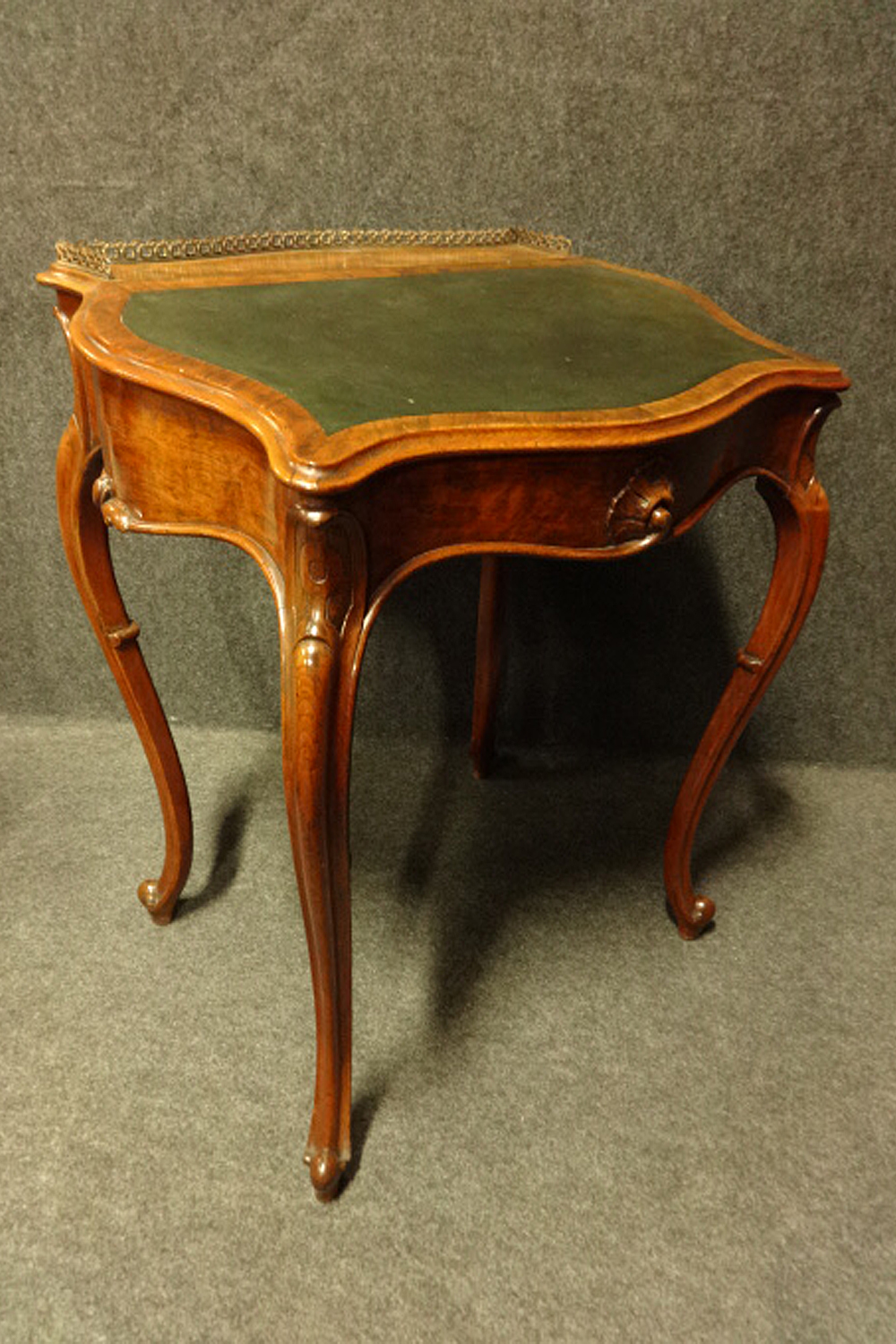 This is a good free standing figured walnut ladies writing desk, standing on cabriole legs, brass gallery, pull out ink well and pen tray to the side, cedar lined with drawer and pigeon holes, in very good original condition.