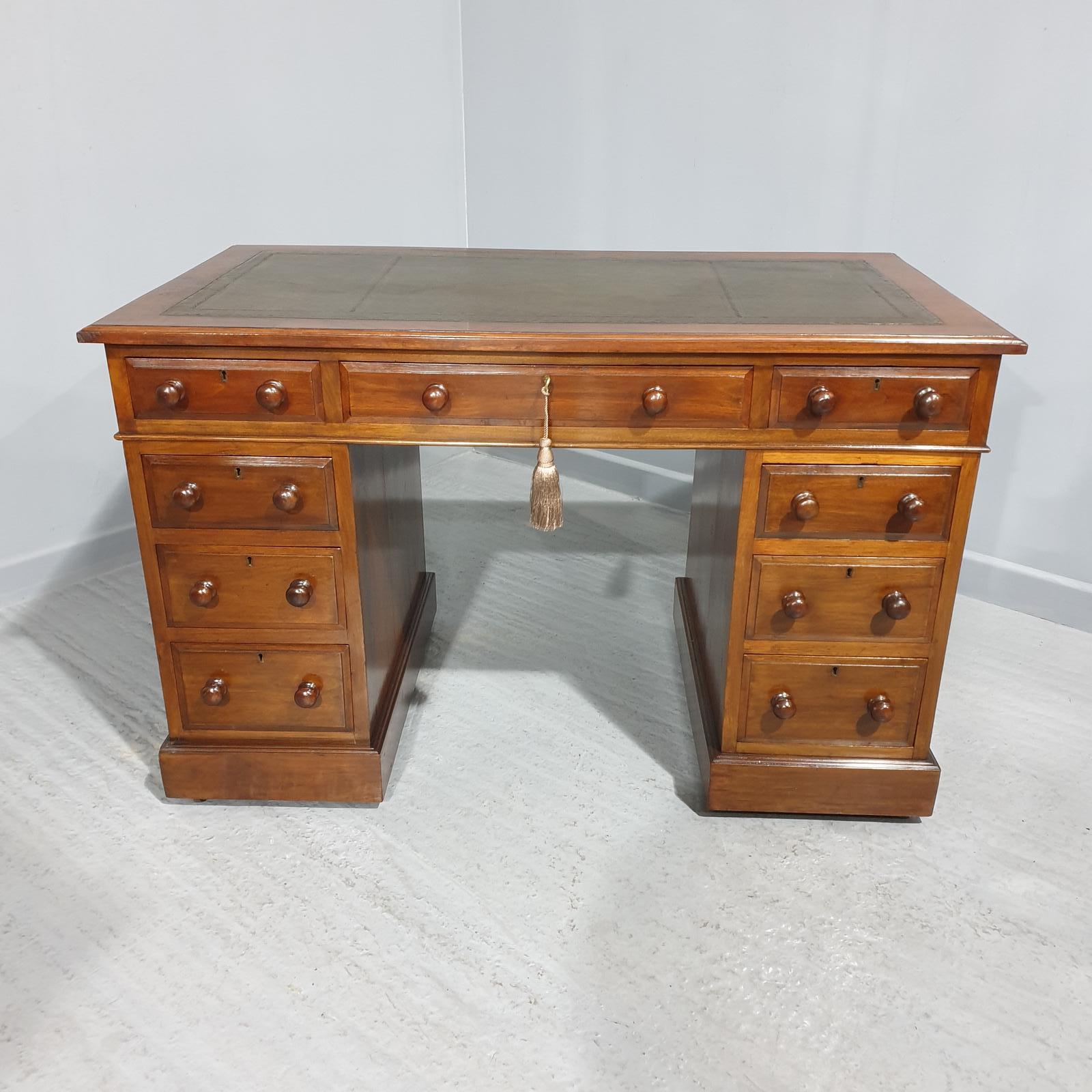 This is a good late 19th Century Victorian antique nine drawer walnut pedestal desk with original wooden knobs, igreen leather top.