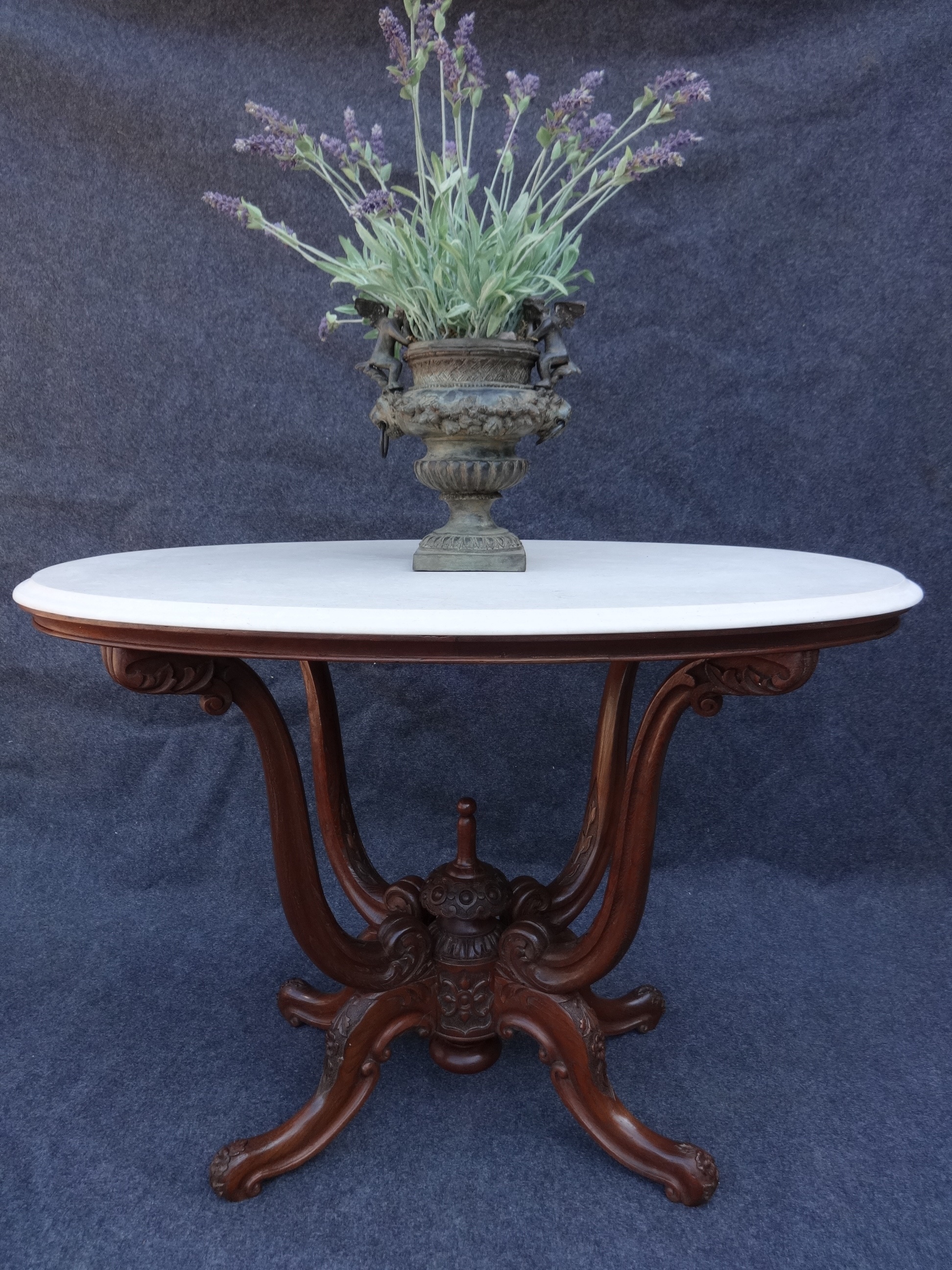 Offered for sale is this fantastic 19th Century antique cradle shape walnut table base which has a cream mottled marble top and is in excellent condition.