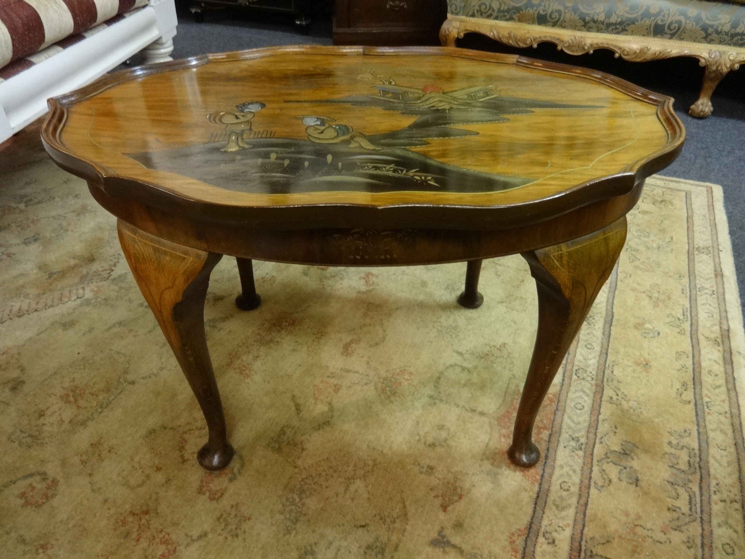 Offered for sale is this oval shaped walnut coffee table with chinoiserie decoration. It stands on cabriole legs.