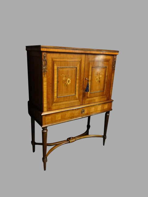 This is a good marquetry cupboard with two inside shelves and full width drawer, standing on stand, brass mounts in very good condition.