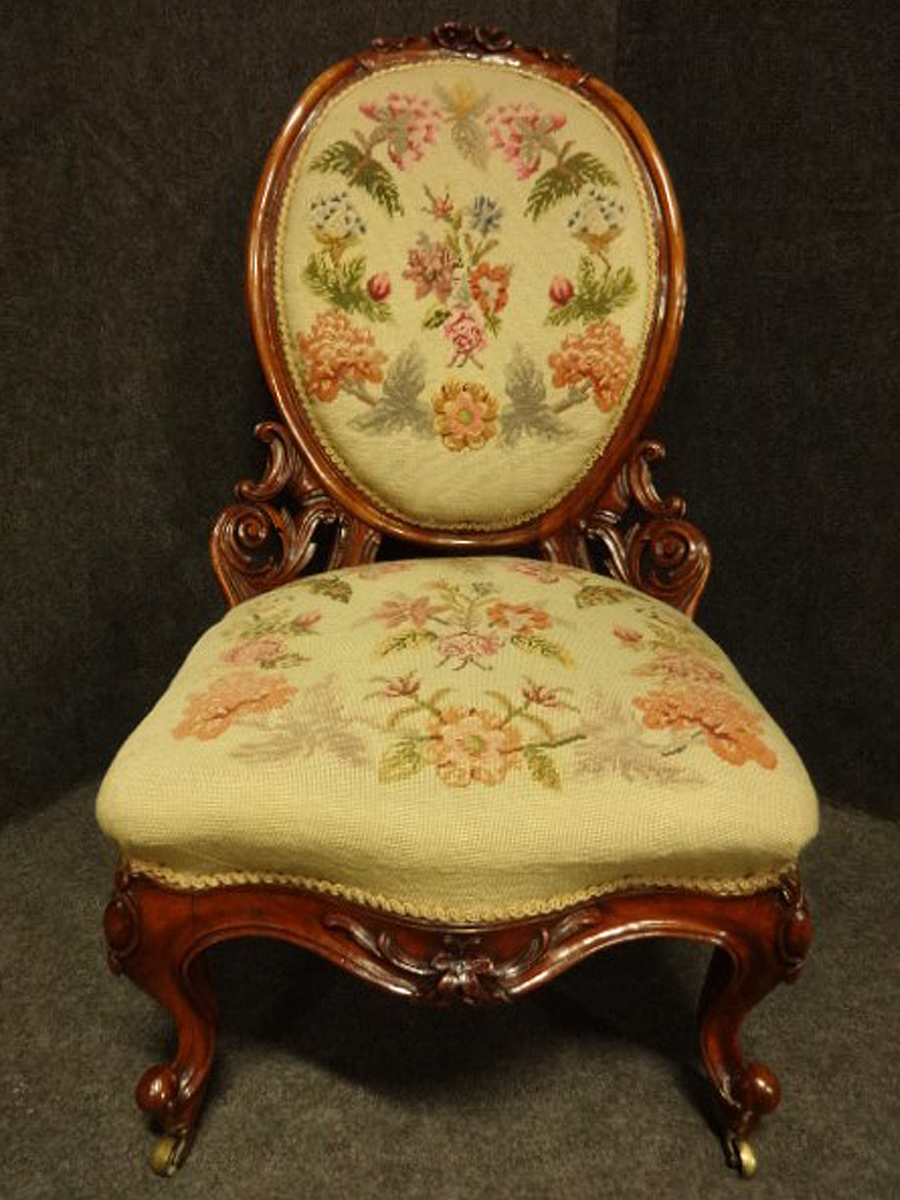 This is an excellent quality walnut ladies chair with good woolwork panels, standing on original brass castors, in excellent condition.