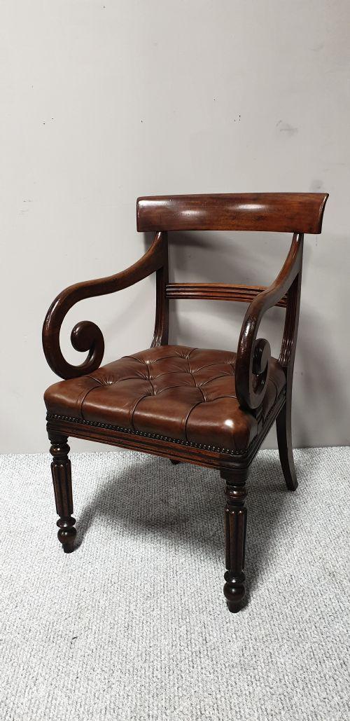Superb quality William 4th mahogany desk chair with deep buttoned leather and brass studded seat, excellent colour and condition.