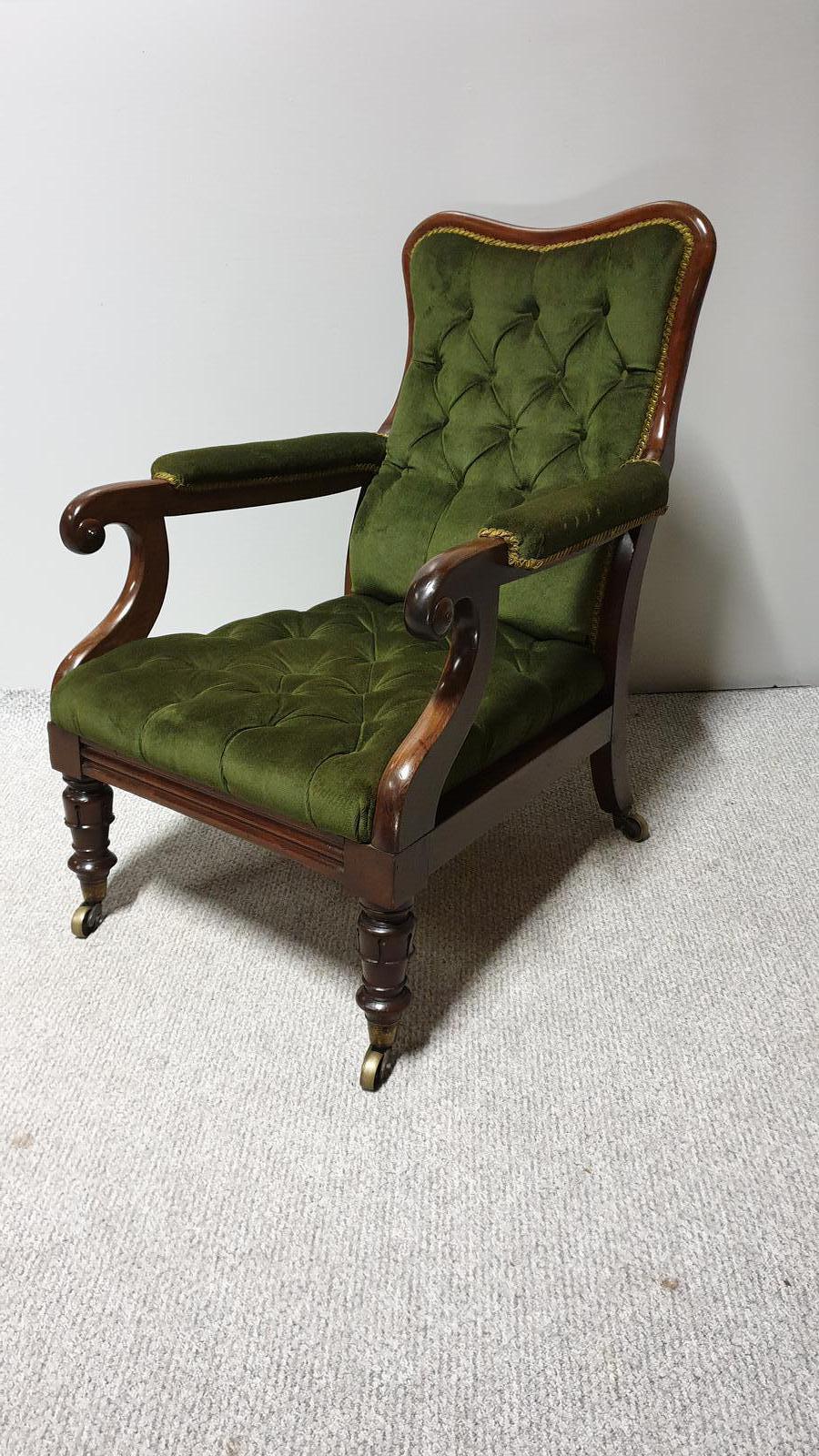 A very nice William 4th mahogany library armchair, with original deep buttoned green plush upholstery, huge brass cup castors, in excellent overall condition.