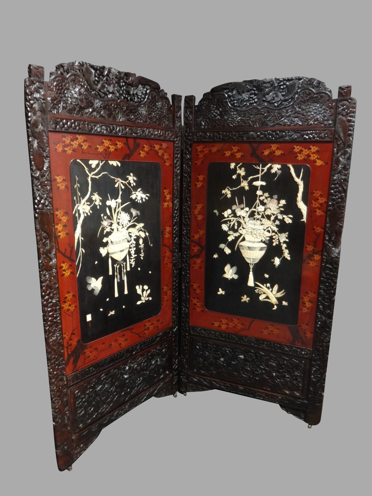 This is a superb 19th Century Chinese antique carved hardwood screen, hand painted and red lacquered back panels. The front is outstanding carved bone and mother of pearl baskets of flowers, foliage, birds and insects, on original steel castors, in excellent original condition, signed lozenge to the bottom left.