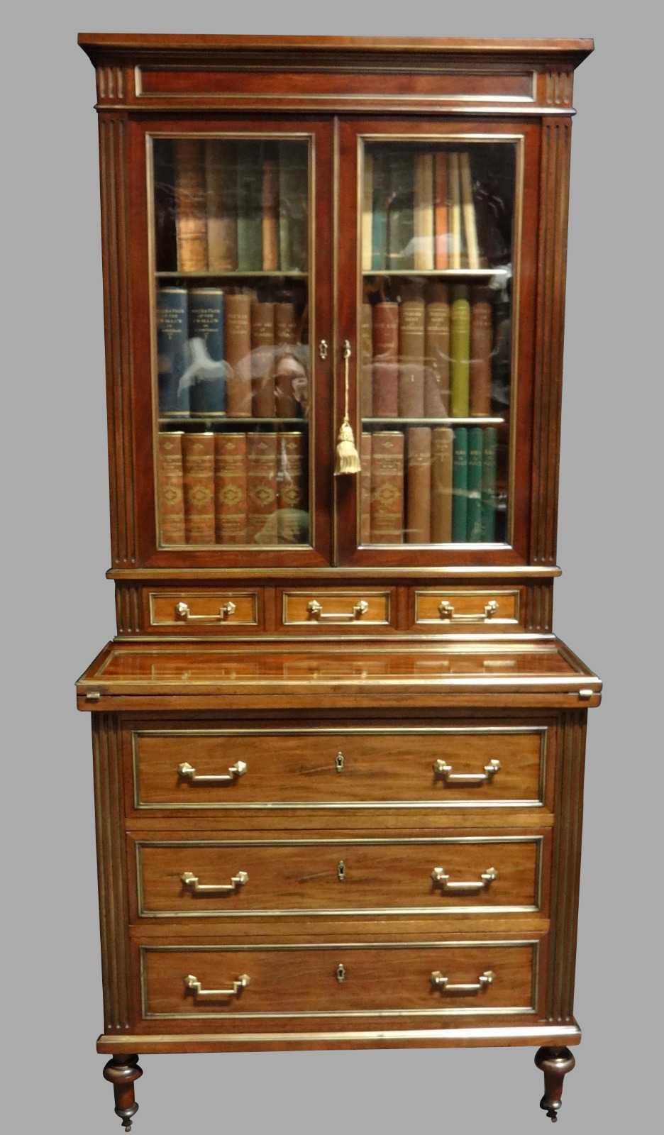 A very good French Empire period dwarf bookcase with two brass fronted shelves, over three small drawers, flip over desk over a three drawer chest, standing on turned feet with brass rings and tips, all inlaid with brass.