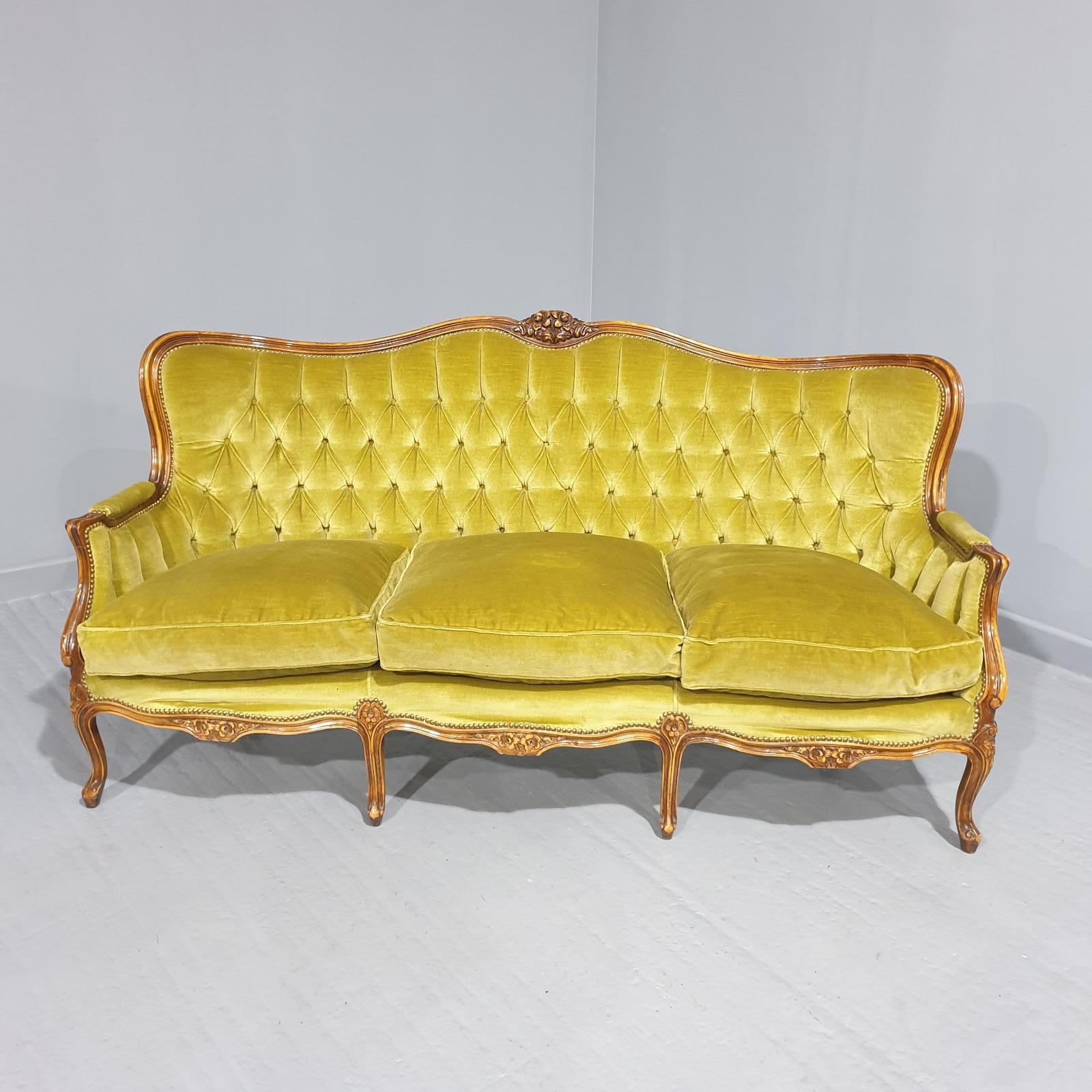 This is a lovely French couch, with deep buttoned curved back, three feather filled cushions, six legs, covered in original green velvet fabric.
