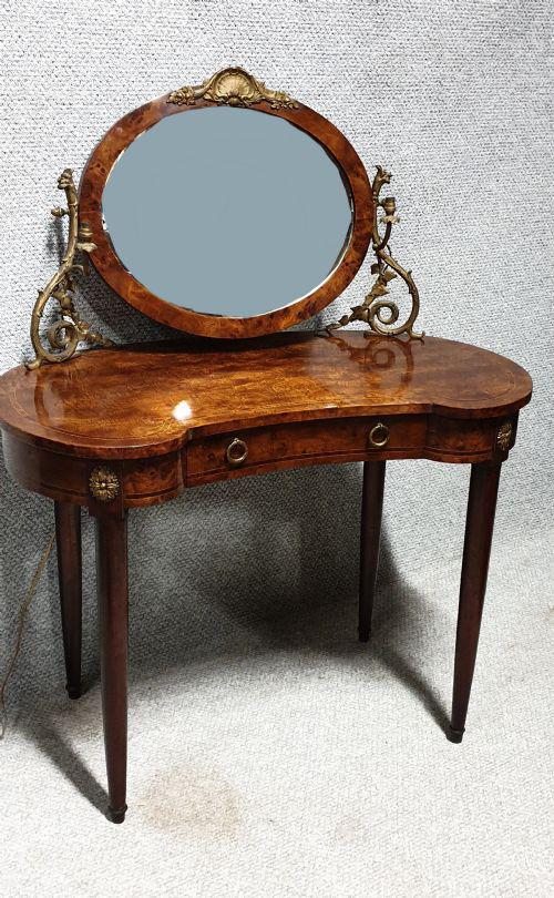 A very French burr dressing table with gilt lamp holders and ormolu mounts. Excellent colour and condition.