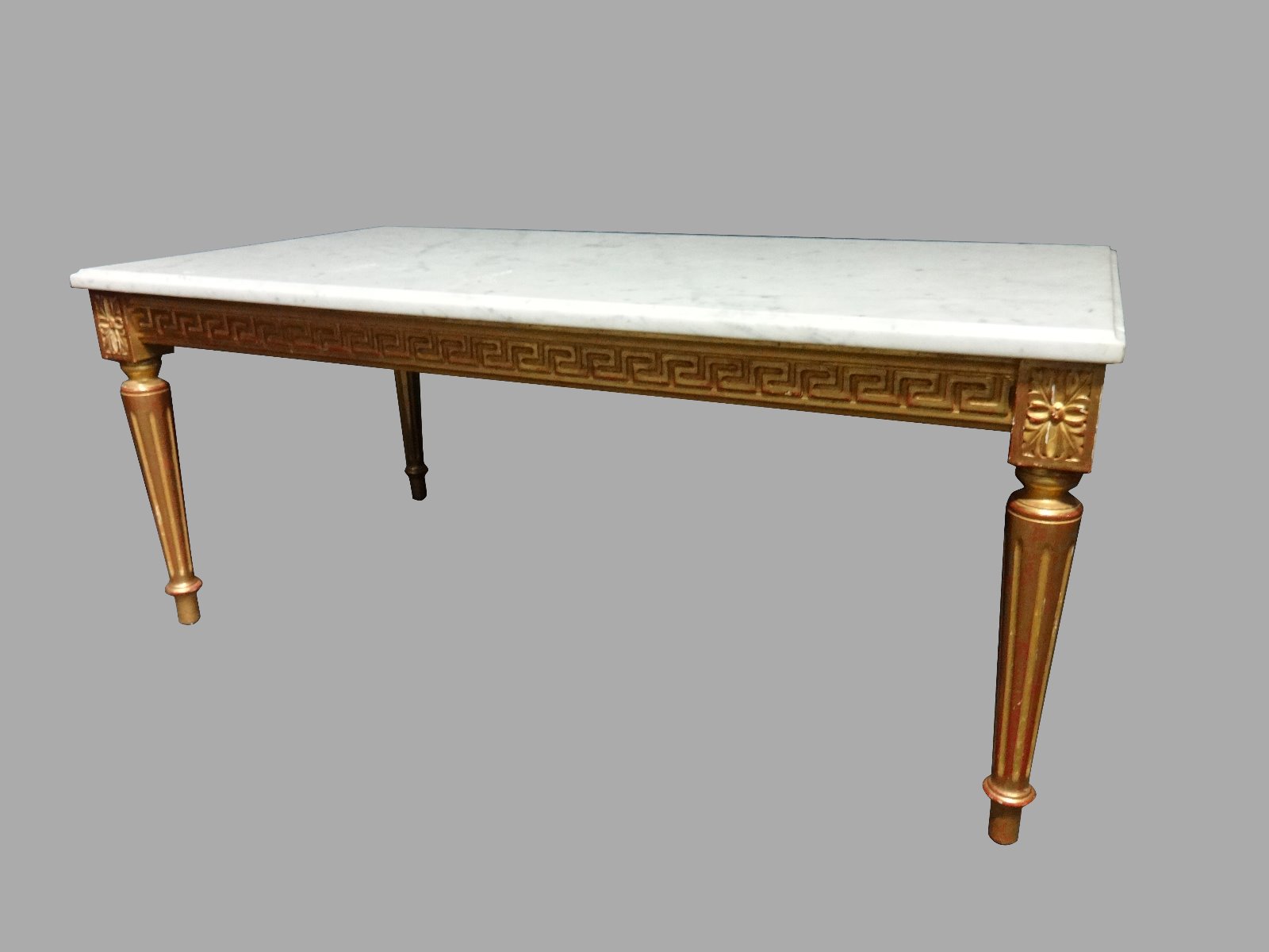 This is a very good French water gilded coffee table with Greek key design and reeded legs, the white marble top is flecked with grey, in very good original condition.