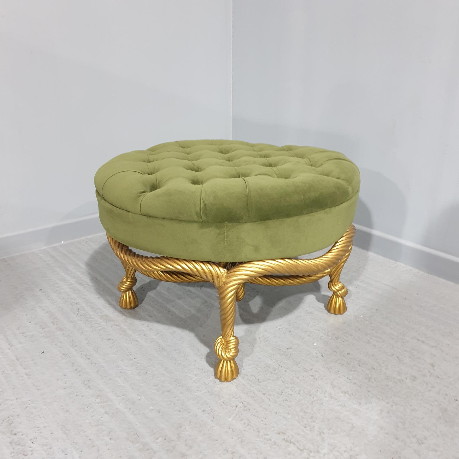 Offered for sale is this fine gilt rope stool, with recently upholstered deep buttoned top, in excellent condition.