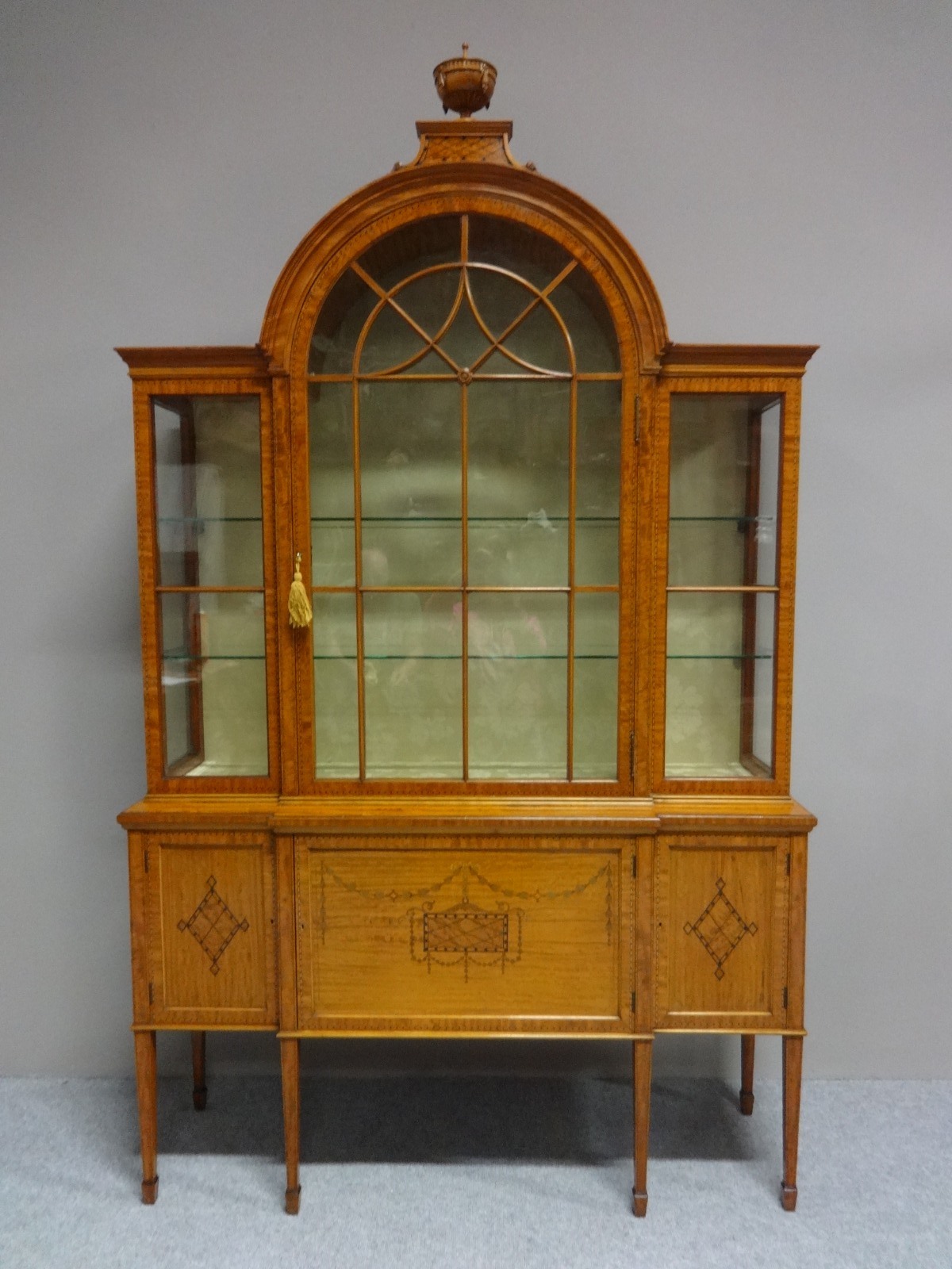 This is a superb Edwardian antique inlaid display cabinet with arched central door with urn on top, two glass shelves, on three cupboard base and six legs, lovely colour and condition.