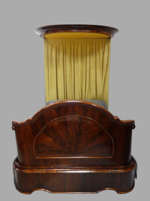 A wonderful mahogany 5ft Victorian half tester bed, in excellent condition with gold drapes. Curved base.