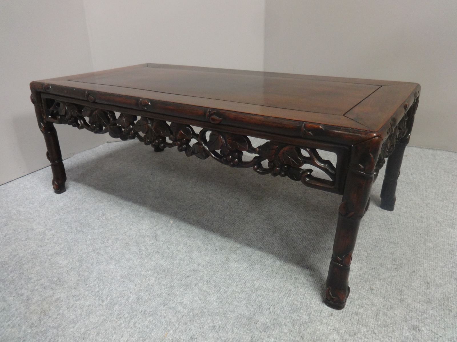 This is a very good oriental padauk wood coffee table with carved grape and fruiting vine decoration, excellent colour and condition.