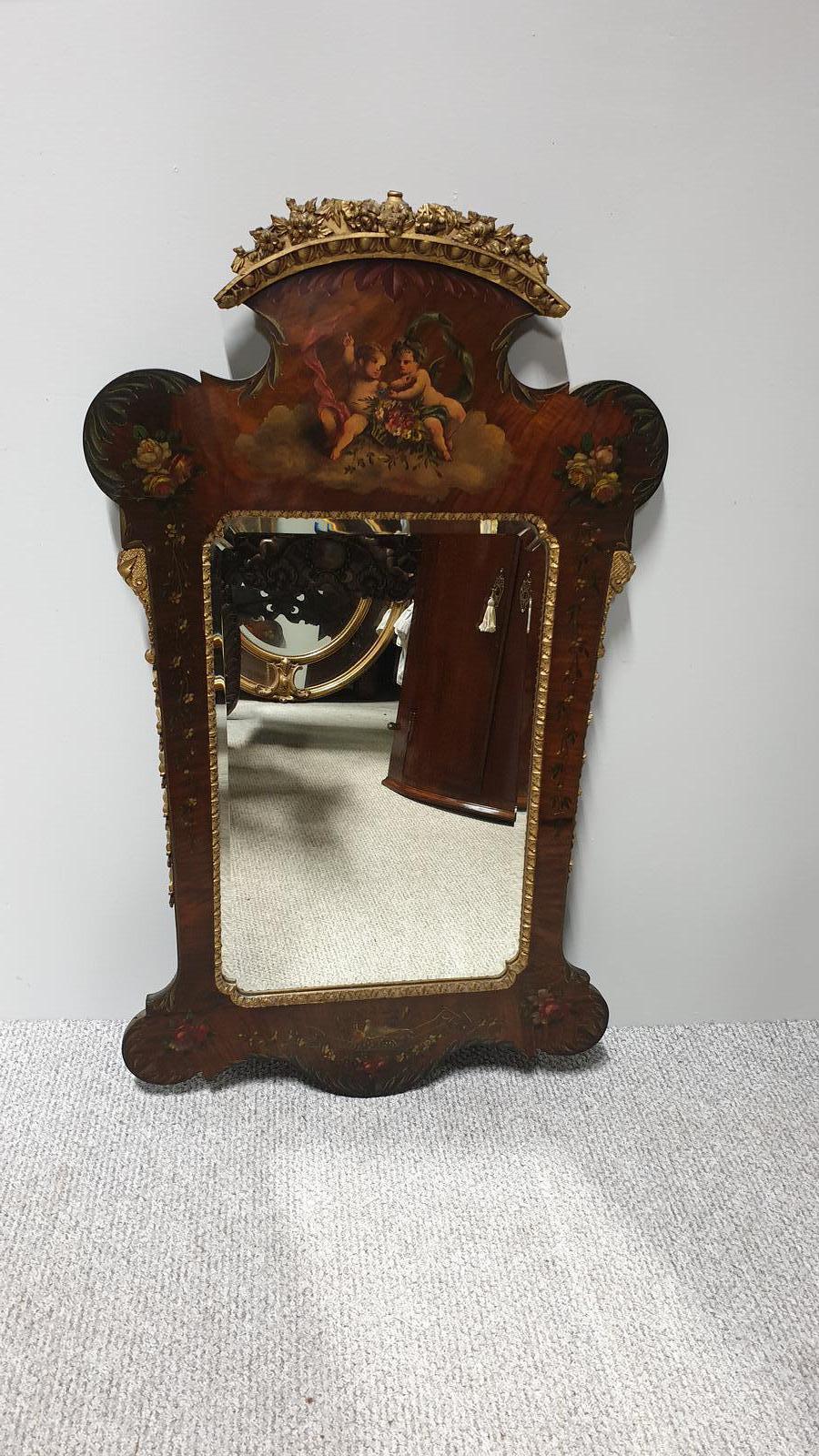 Fabulous satinwood mirror, painted with cherubs, flowers and foilage, gilt gesso flowers to the top and sides, bevelled mirror plate, in excellent original condition.