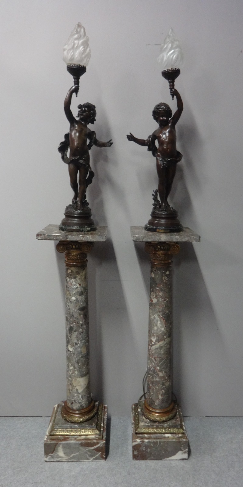 A superb pair of French marble pedestals with gilt brass mounts and a pair of bronzed spelter cherub lamps (rewired, and stamped 'Aug Morreau'), Can be used together or seperated, all in super original condition.