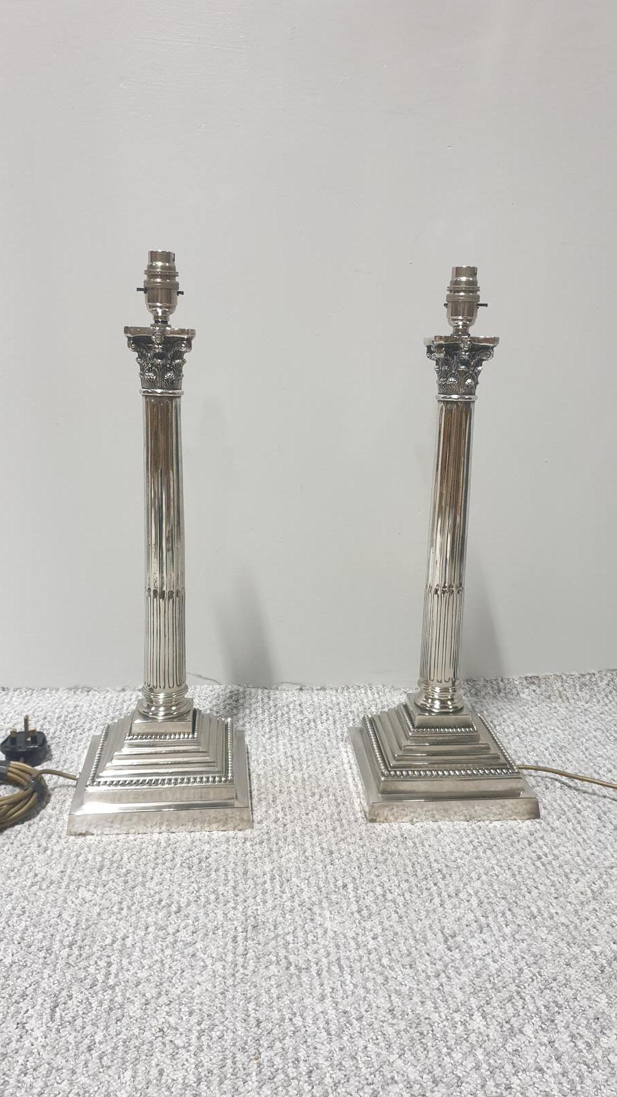 A very nice pair of silver plate corinthian column lamps, stamped Aw Ep, PAT tested and ready to use, in excellent condition.