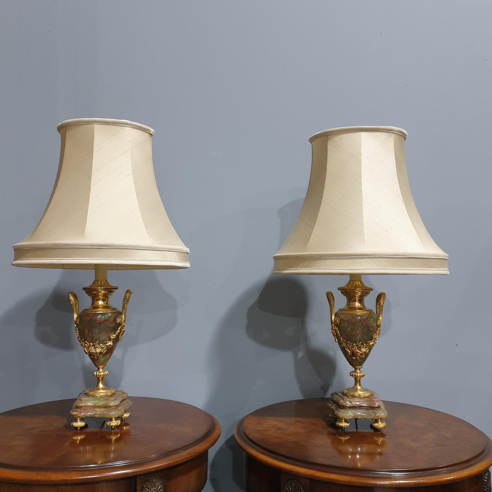 A very nice pair of green marble urn shaped table lamps, with superb quality gilt mounts, shades included, rewired and ready for the home.