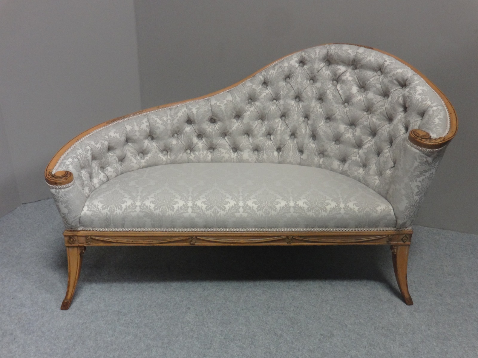 This is a very pretty Adams style two seater curved chaise / settee, standing on outswept legs, deep buttoned silver grey damask upholstery (new), in lovely condition.