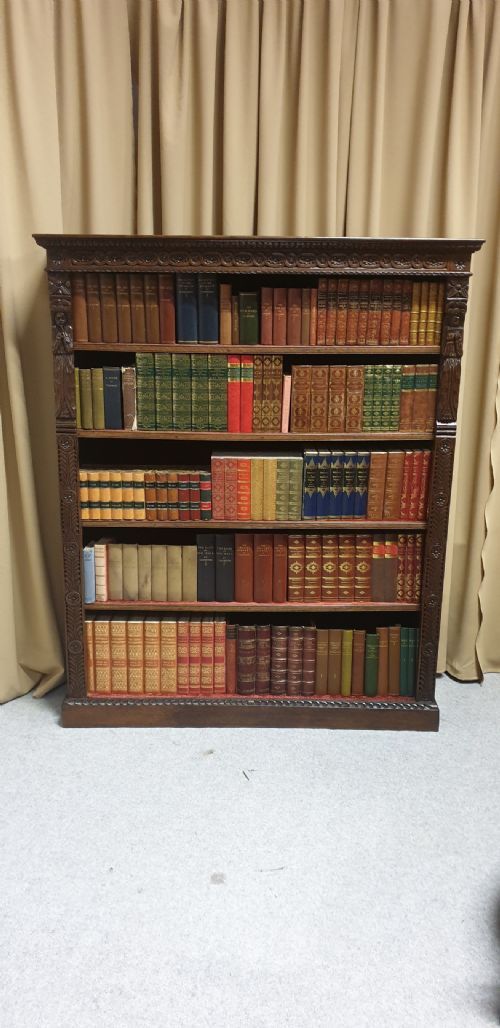 A superb quality solid oak 19th Century Victorian antique open bookcase with four adjustable shelves, original plush velvet lined, solid plank back, excellent colour and condition.